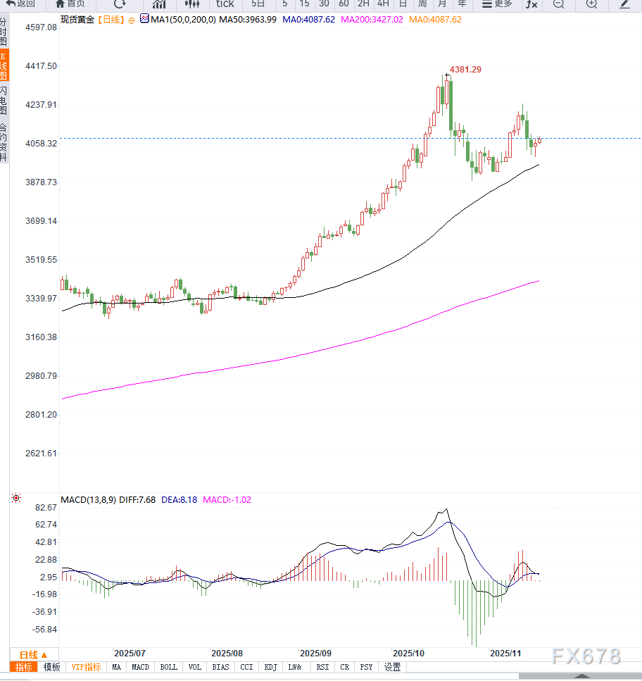 从日线图观察,黄金在靠近4,000美元整数位附近获得显著支撑,短期呈现弱势反弹结构。价格目前位于20日均线上方,但整体仍受压于4,100美元的强阻力区。