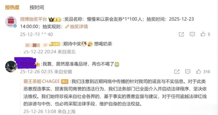 霸王茶姬回帖称:“我们注意到近期网络中传播的针对我司的谣言与不实信息。对于此类恶意捏造事实、损害我司商誉的违法行为,我们法务部门已全面介入并启动法律程序,坚决依法维权。”