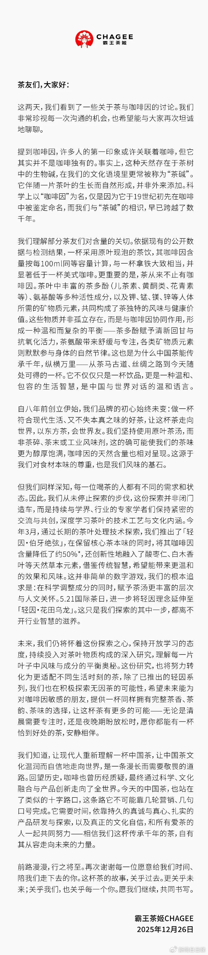 霸王茶姬官方微博发文回应“咖啡因”争议