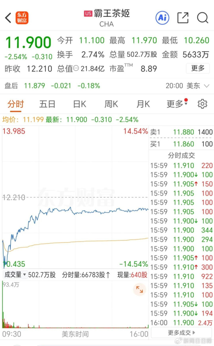 受此消息影响,霸王茶姬26日美股开盘一度跌超14%,创上市以来新低。截至收盘,霸王茶姬美股报11.9美元/股,跌2.54%。